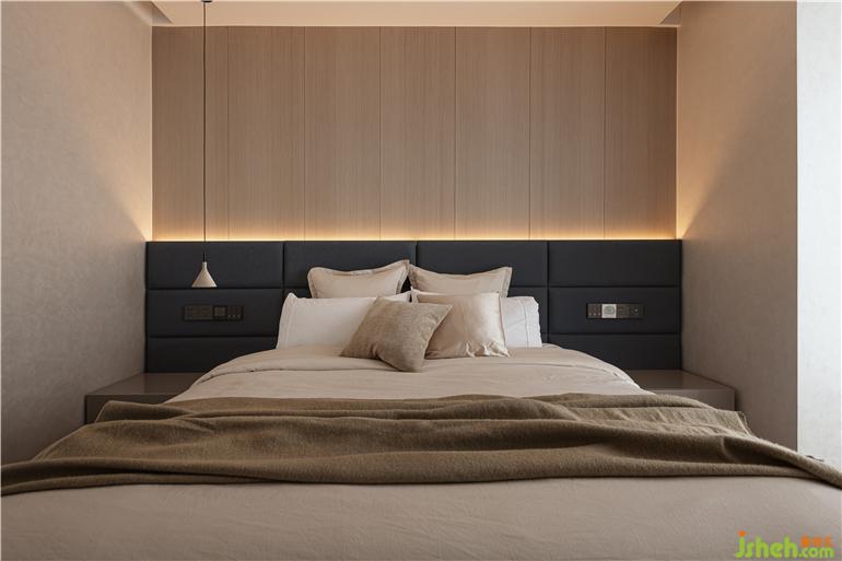 走進臥室,原木色的墻面搭配黑色的軟包,筆直的時尚吊燈和墻面讓臥室的精致度得到大幅提升,潔白的窗簾也讓暗色的空間眼前一亮,讓人充分感受現(xiàn)代安靜的生活方式訴求