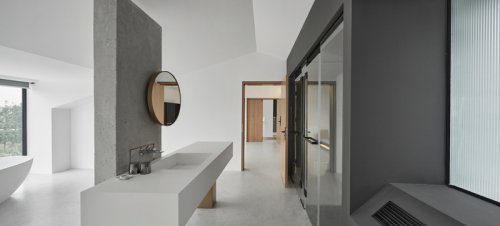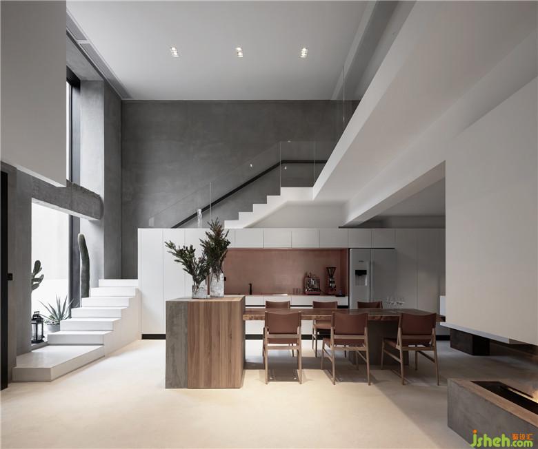 原建筑為地面以上2.8米層高四層空間等分布置,以軸線分布,拆除一二層空間前半部分樓板做挑空,樓梯側(cè)移,重新規(guī)劃出空間的動線關(guān)系,室內(nèi)設(shè)計師以中空為中心,依次展開入住、待客、用餐等功能,將白色方塊懸浮于空中,簡化原先復(fù)雜的立面關(guān)系,同時保留拆除時的混凝土梁,在現(xiàn)有空間里展現(xiàn)建造痕跡。