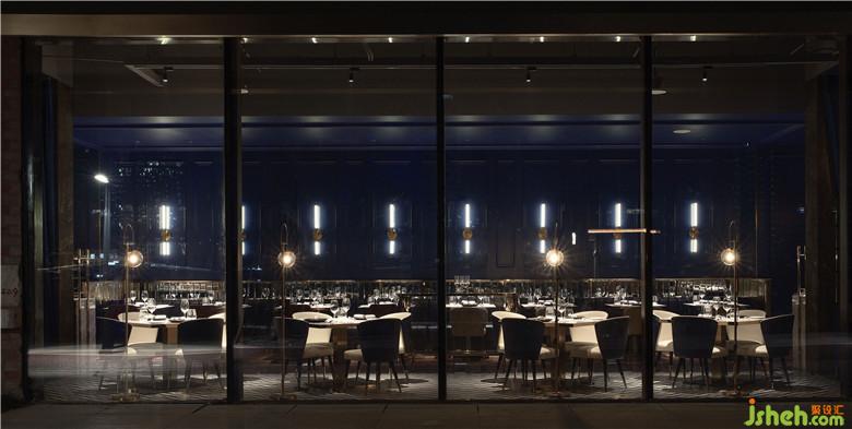 巨大的落地玻璃將江面的風景引入室內(nèi),保留出老船廠的百年立柱,搭配黃銅、大理石、鏡面等高光材質(zhì),折射出當下與過往的故事。