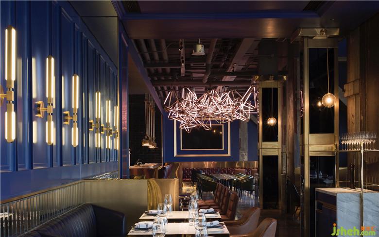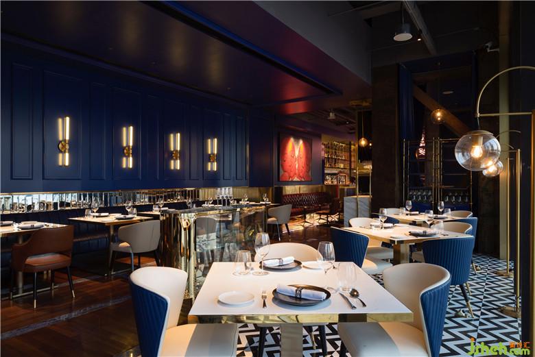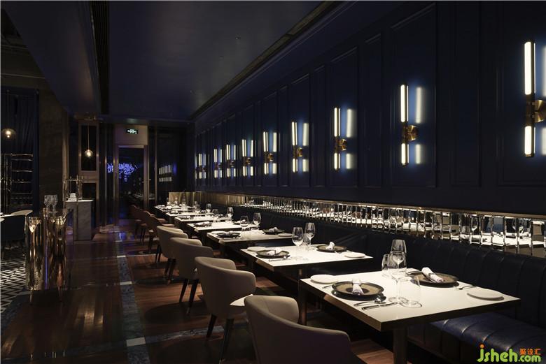 整個建筑呈長條形,近4米高的落地玻璃將黃浦江風景一覽無余,根據(jù)建筑形態(tài)把就餐區(qū)依條形布置,將廚房靠后,以此呈現(xiàn)出酒廊的基本空間形態(tài)。室內(nèi)設計師將300m2的酒廊劃分為餐區(qū)、酒吧、廊吧、廚房四大區(qū)域,以藍色為主基調(diào)將幾個區(qū)域連成一體。