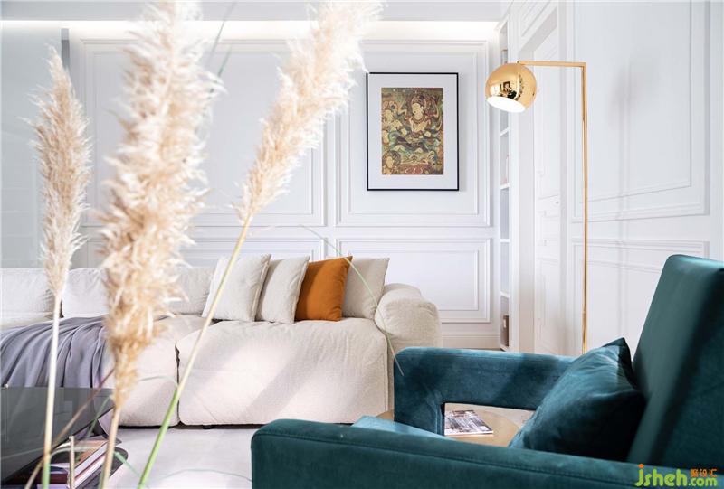 The wall of the living room is made of white background, and the simplified European design can be seen on the line board, and the south wall is all treated as a bookcase to expand the room space. The hanging paintings behind the sofa are extremely rare, and they are part of the Dunhuang frescoes that were cut and copied.