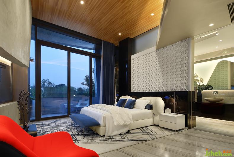 臥室在繼承整體空間現(xiàn)代感強(qiáng)烈的幾何線面之外,介入細(xì)節(jié)可品的飾品和不規(guī)則設(shè)計(jì)的藝術(shù)床品,寧靜之中,彰顯出慵懶而閑適的生活態(tài)度。