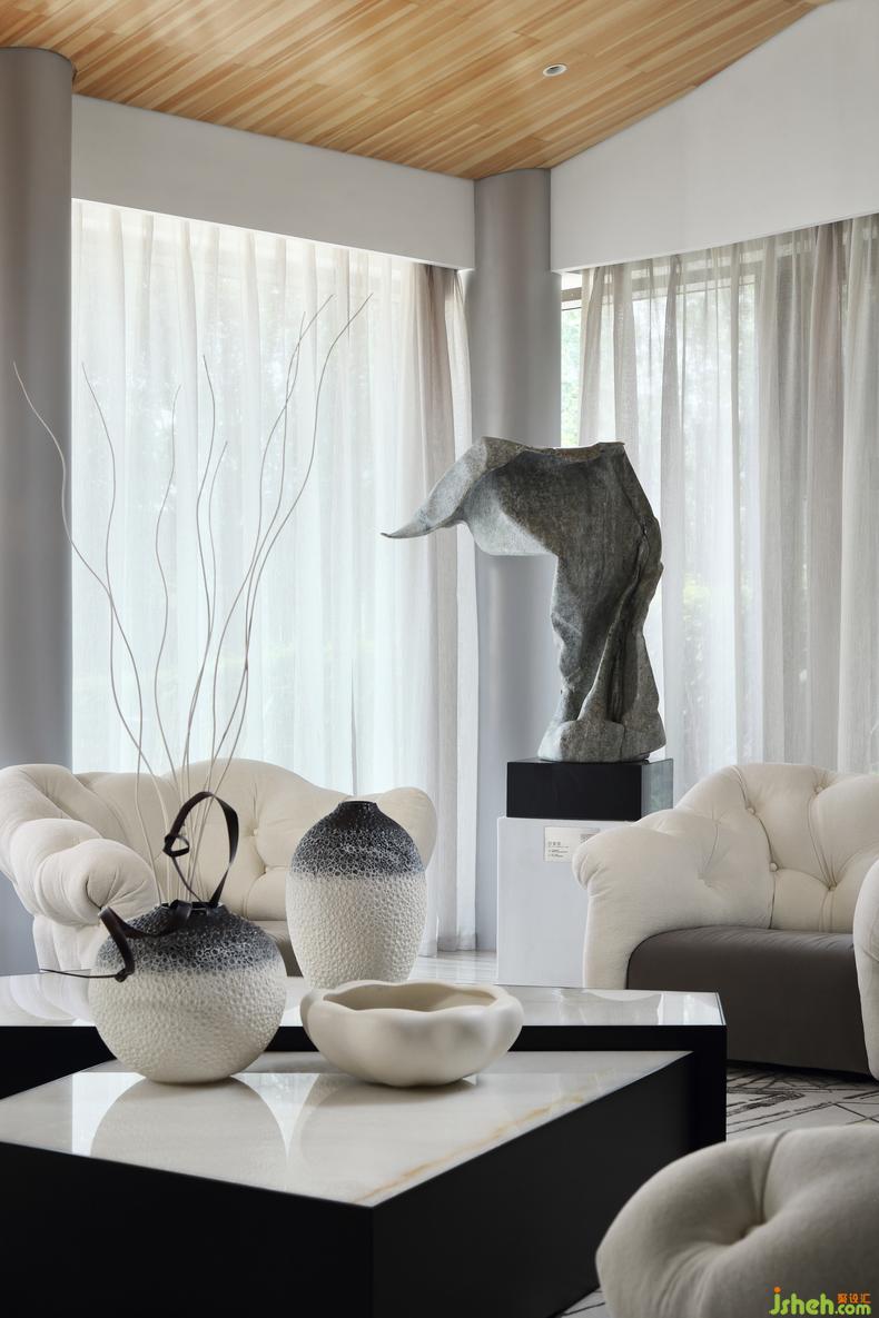 冷冽克制的黑白灰下,強(qiáng)烈的幾何構(gòu)成,形成極具現(xiàn)代感的空間基調(diào),來(lái)自臺(tái)灣著名藝術(shù)家許東榮先生的雕塑作品,為冷靜的空間,注入了一絲不羈的靈魂。