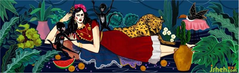 由設(shè)計(jì)師和原創(chuàng)插畫藝術(shù)家以弗里達(dá)為原型創(chuàng)作的壁畫——《弗里達(dá)的下午茶》,意在表達(dá)生活于藝術(shù)里的解脫。