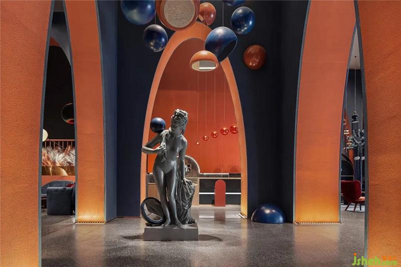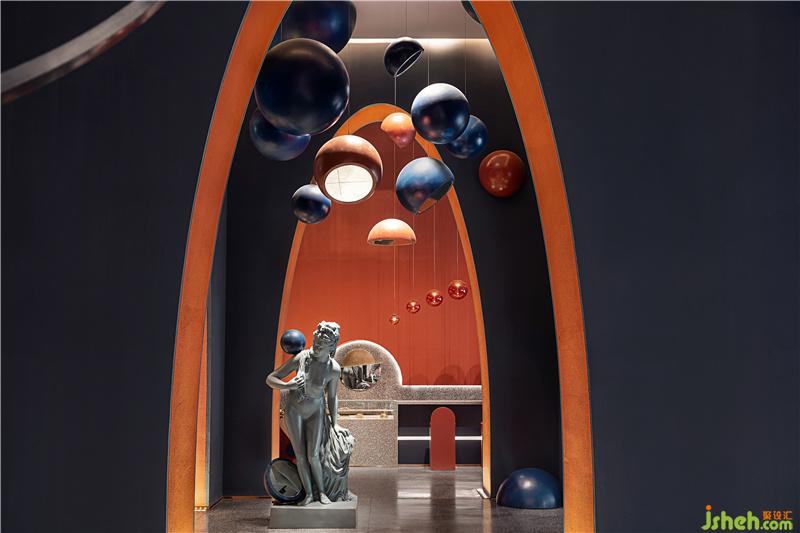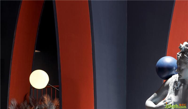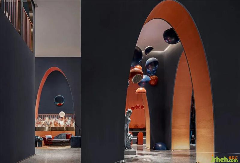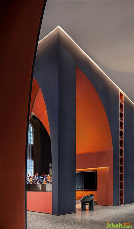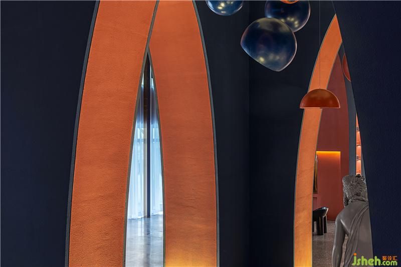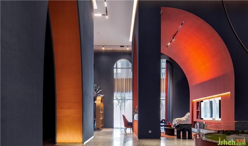 柱體間由弧線形挑高拱門鏈接往里延伸且層次遞進(jìn),呈現(xiàn)出極具沖擊力的視覺(jué)感受,同時(shí)又為售樓處提供了充足的展示面與靈活的空間體驗(yàn)感。