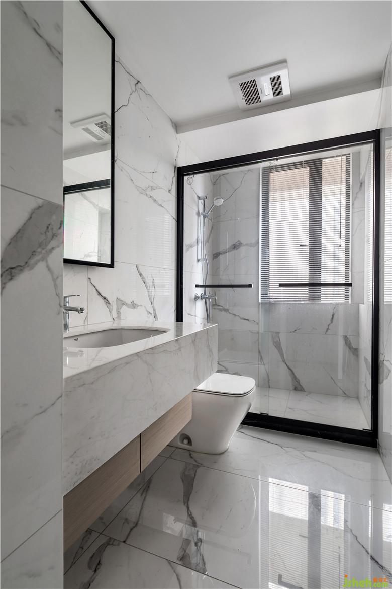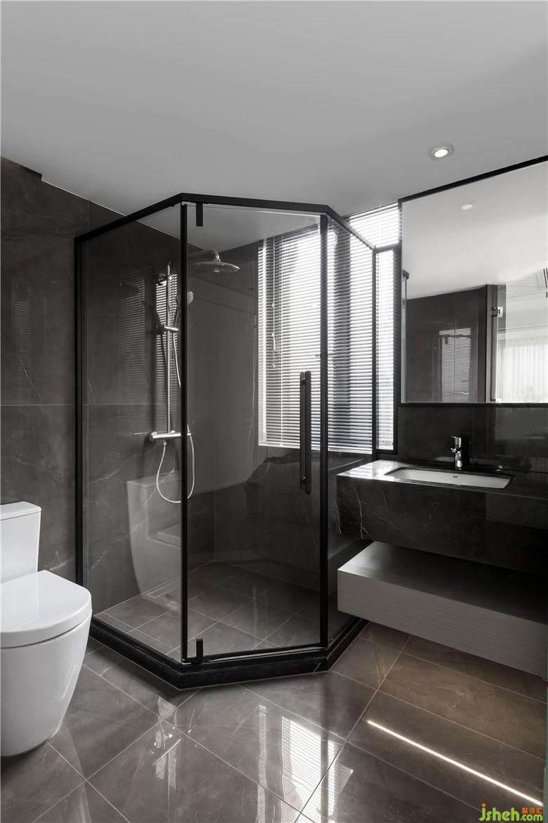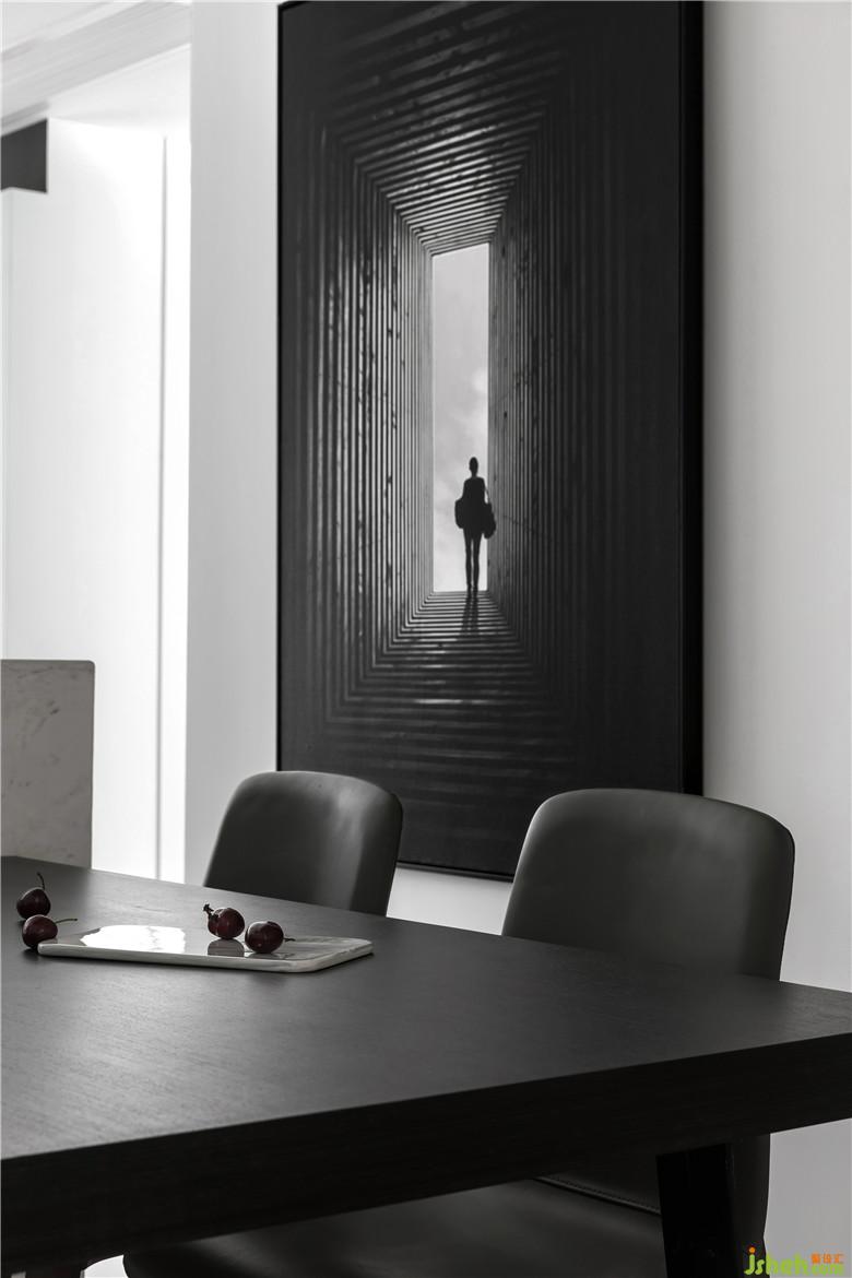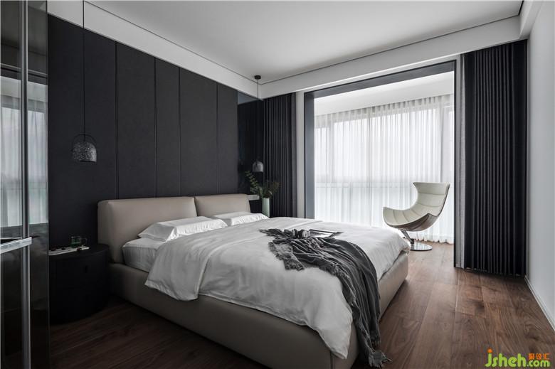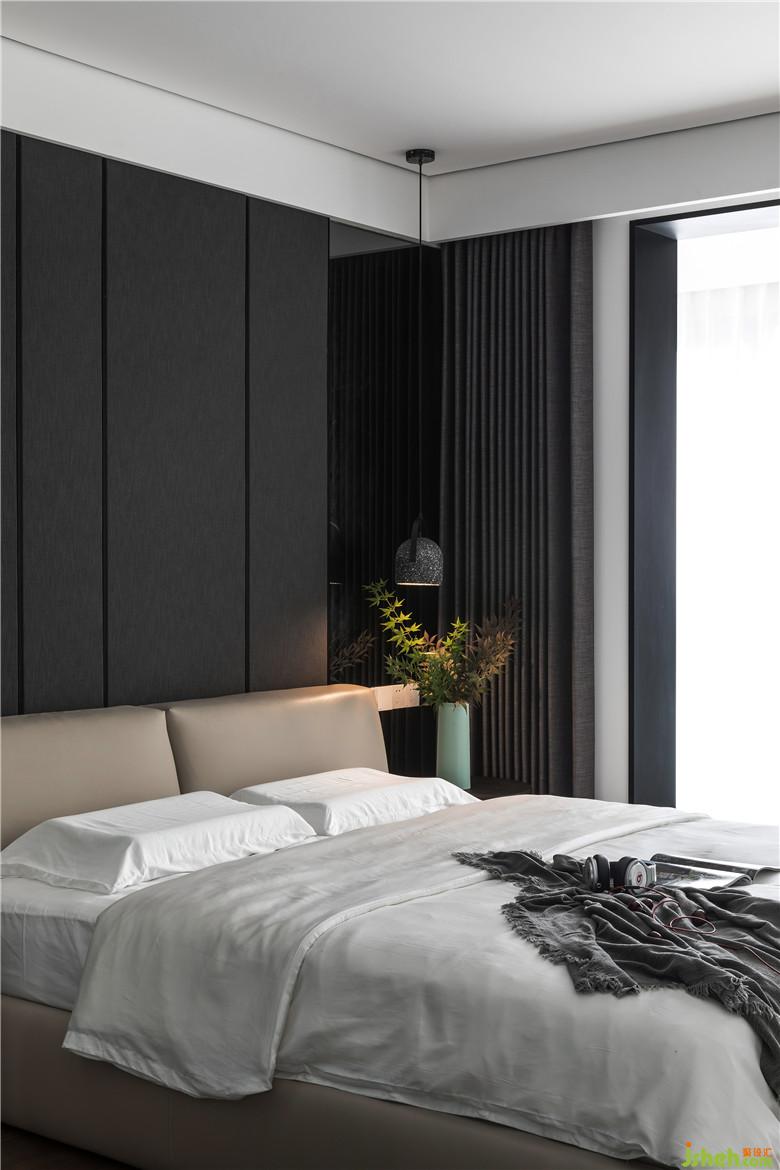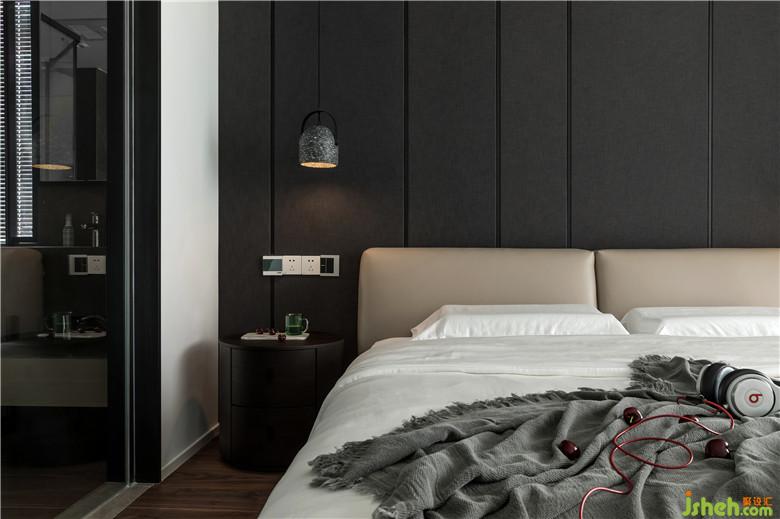 主臥豐富的黑暗色調(diào)是非常引人注目的,床頭背景采用硬包+黑玻的設(shè)計,搭配上胡桃木地板、低飽和度軟裝,卻在房間其他地方大量的空白處得到平衡,展現(xiàn)出屋主與眾不同的個性與時尚。