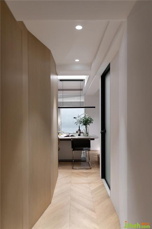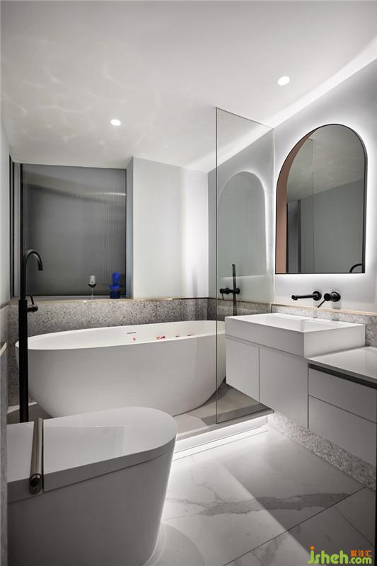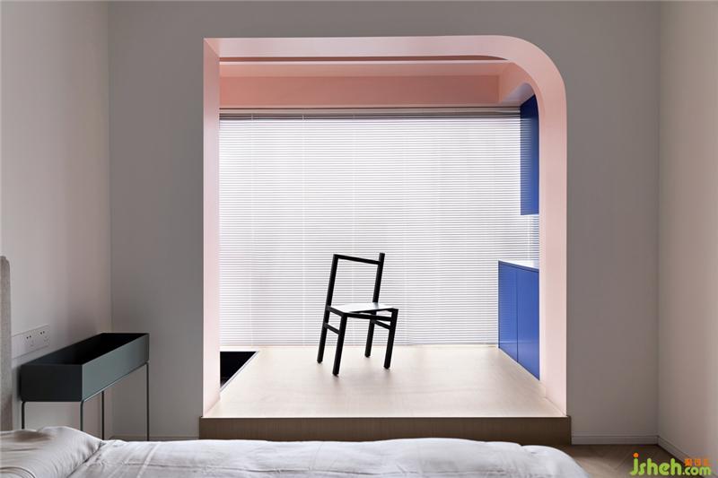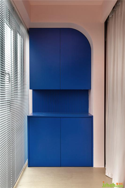設(shè)計(jì)師選用藍(lán)色與粉色搭配,形成柔和的色彩撞擊,裝修設(shè)計(jì)采用弧形墻面設(shè)計(jì)增加藝術(shù)感。陽臺(tái)左側(cè)預(yù)留種植室內(nèi)觀賞植物。