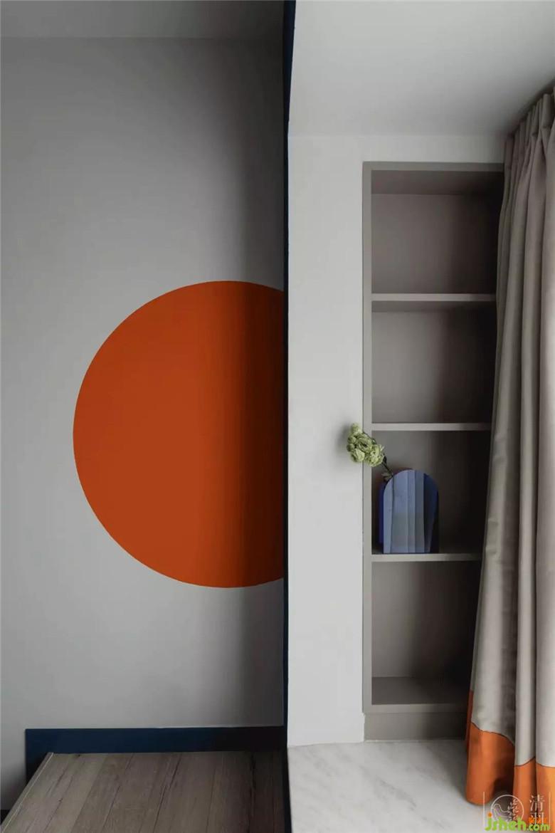 橙色的墻面色塊、窗簾色帶、地毯的抽象幾何,在克萊因藍(lán)的底色上做點(diǎn)綴,起到最具活力的調(diào)和,是生命的躍動。