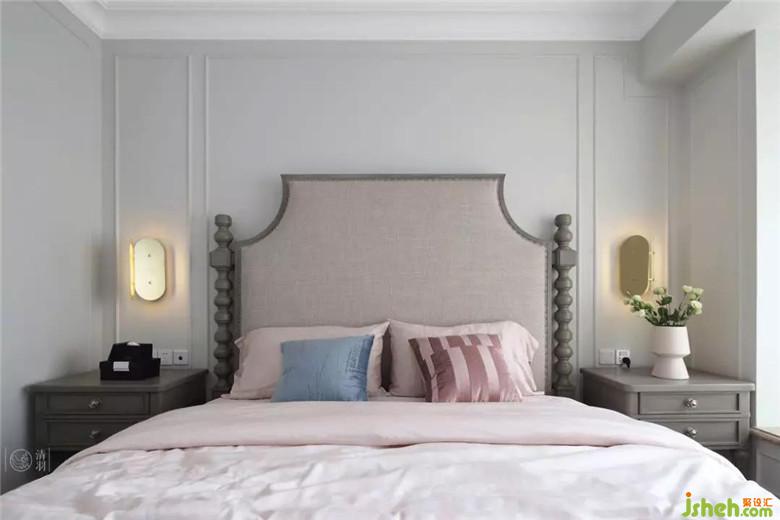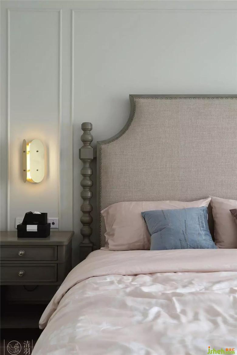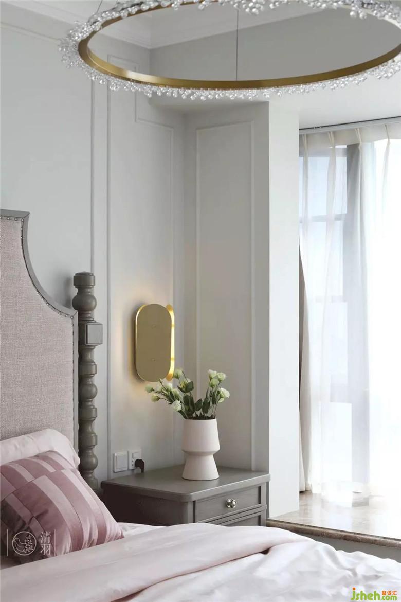自古紅藍(lán)出cp,這里清爽的藍(lán)與粉嫩的紅呼應(yīng)了客廳的設(shè)計(jì),搭配上精美的吊燈和大氣的床頭營(yíng)造出了浪漫感和如玉一般溫和柔潤(rùn)的視覺觀感,妥妥地滿足女主人的少女心。