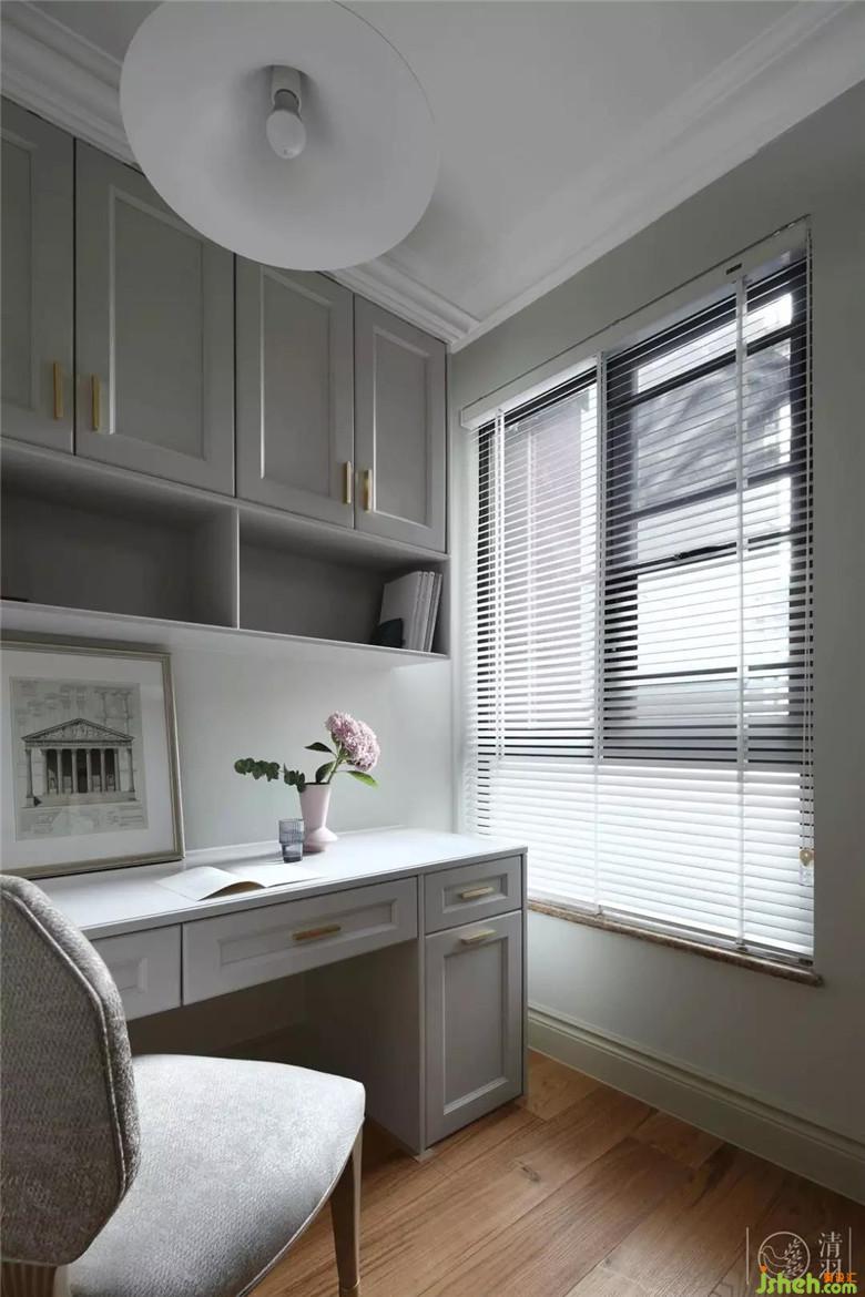書房間采用無彩色和自然色,柔和溫暖的日光從一側(cè)的簾間傾灑下來,頂燈就如一朵倒懸綻放的喇叭花??臻g之中流瀉著溫馨靜謐的氛圍。