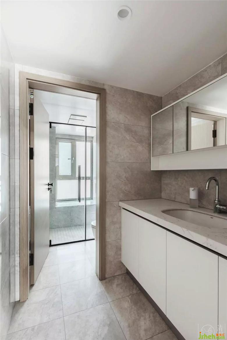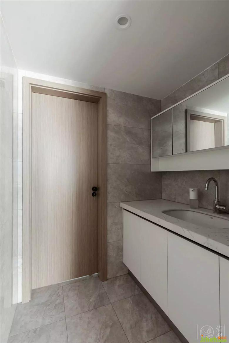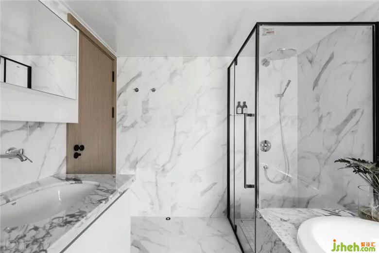 但主衛(wèi)就完全不同了,大膽地將追求自由的心展露無遺:墻面用大理石紋墻磚全鋪,洗漱臺臺面和浴缸臺面則是用到天然大理石,石材本身特有的紋理使整個空間給人一種水波浮動,影影綽綽的幻覺,如同墜入一個海洋的夢境中。