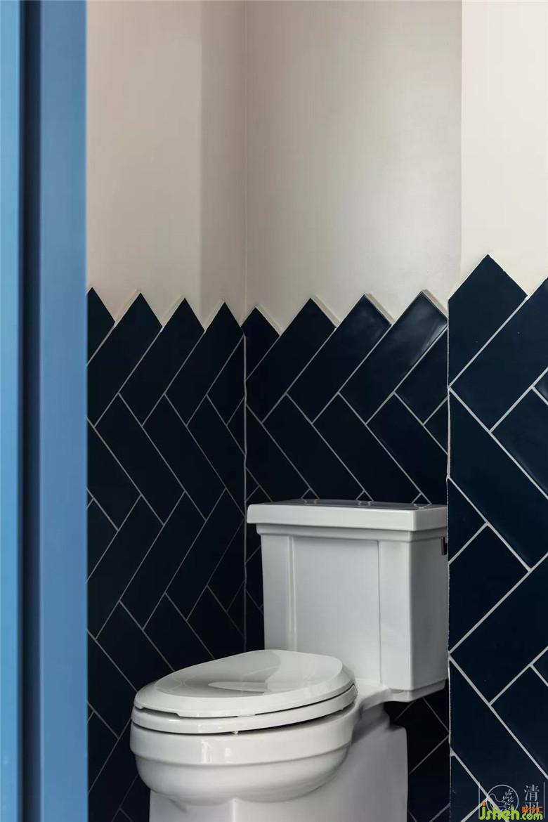 次衛(wèi),女兒房的用了梵高桃花粉和星空藍(lán)來做瓷磚的選擇,人字鋪貼的方式也讓空間在視覺感受上變得不再狹小,有趣而雅致。