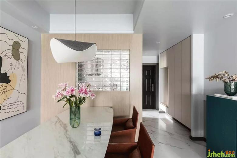 餐廳空間里擺著一張長長的大理石面餐桌,一盞別致的吊燈恰如一片倒掛的荷葉,又似一瓣花瓣。儲物柜旁,拱門造型的鏡子尤為引人注目,一家?guī)卓谧诓煌奈恢?,透過同樣的一面鏡子,看到的一景一物卻是各有差異。設(shè)計巧妙、布置經(jīng)心,讓家里人在享用美食中也似乎多了些許興致。