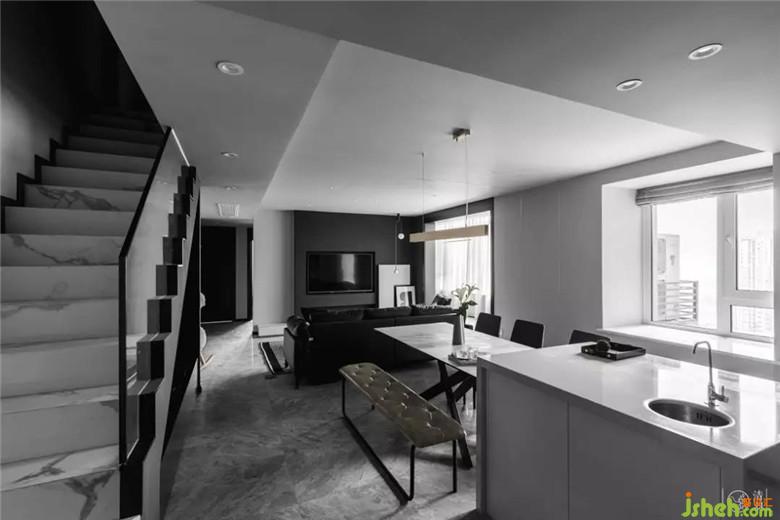 盡管沒(méi)有加入任何隔斷的設(shè)計(jì),通過(guò)燈光布局、軟裝的搭配使這個(gè)區(qū)域可休閑可會(huì)客的氛圍依然濃厚。沙發(fā)與餐桌間留足了70cm的間距,小朋友玩耍跑起來(lái)不容易磕碰,也完美的展現(xiàn)了空間一層層的過(guò)渡關(guān)系。