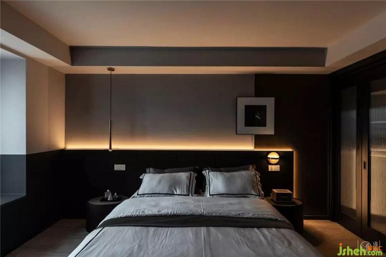 墻面選用了更經(jīng)濟(jì)實(shí)惠的乳膠漆,上灰下黑的搭配,延伸了床頭軟包的視覺(jué)感,也呼應(yīng)了主題色調(diào)。