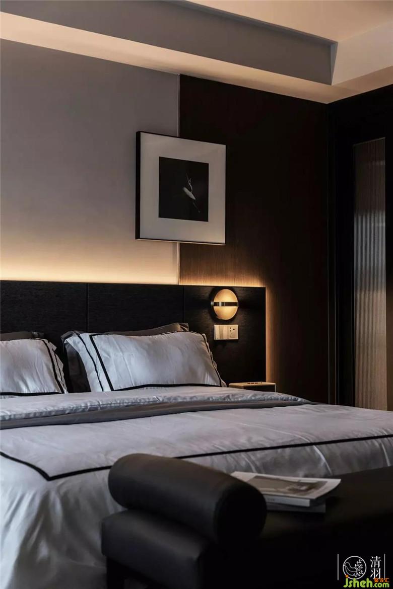 位于二樓的另一間主臥采光不如一樓好,我們?cè)诖差^的軟包上做了一點(diǎn)小手腳,用了美線燈和床頭的小壁燈來(lái)提升空間氛圍。