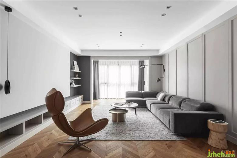 地板是木色。一般這種風(fēng)格,大家都會(huì)用很多成品木飾面。但我們不想把家做成小型muji賣場(chǎng)。因此,用了大塊的不凸顯木紋的啞光實(shí)木護(hù)墻板做立面空間。再則,她選的沙發(fā)非常有質(zhì)感,我們也希望背景退后,不要喧賓奪主。