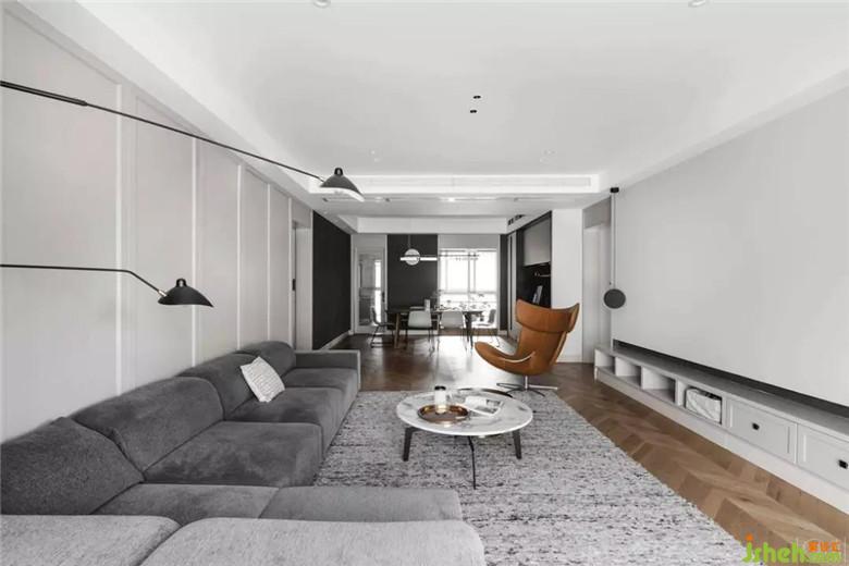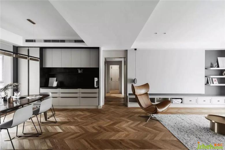 客廳沒(méi)有電視,用大面積的留白背景墻留給投影幕布,右邊的灰色和餐廳黑色黑板漆墻面呼應(yīng)??梢钥吹剑麄€(gè)空間都是大塊面的分割,減少零碎面積拼湊,在視覺(jué)上拓寬空間,并借助魚骨拼的地板增加空間景深感。