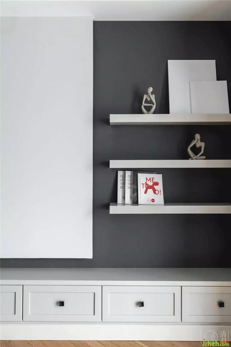 餐廳區(qū)域,墻面用黑色乳膠漆,和黑板漆呼應(yīng),在轉(zhuǎn)角做了分色處理,用簡單的辦法增加圍合感,墻面基本沒有淺色卻絲毫不顯突兀。