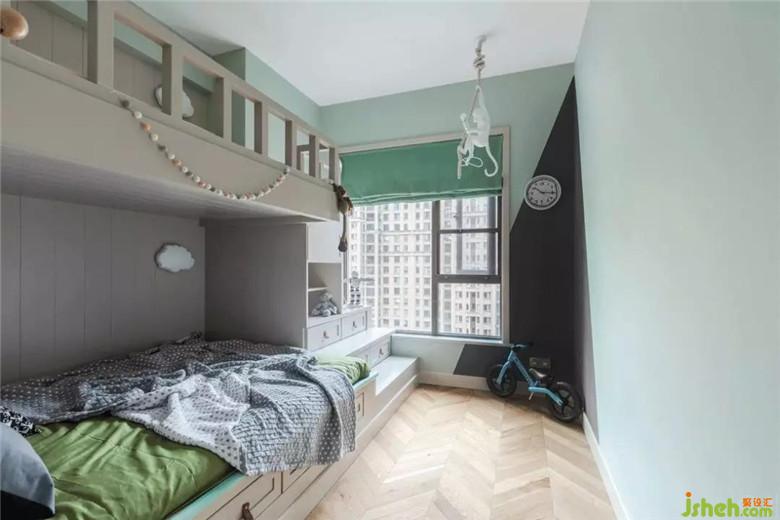 兒童房現(xiàn)在的小主人是個活潑可愛的小男生,因此乳膠漆的顏色我們用了低保和度淺綠色、輔以同色系、飽和度稍高一點(diǎn)的窗簾,搭配白色的床體、原木色的魚骨拼地板。清爽有活力,也輕松的成長空間躍然呈現(xiàn)!