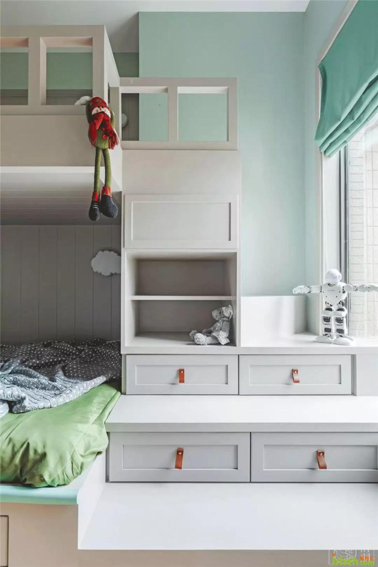 上下鋪兒童床,有效的創(chuàng)造了收納空間,也給了未來更多可能。