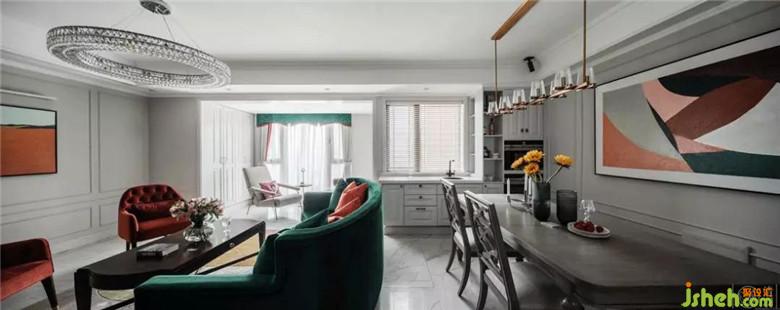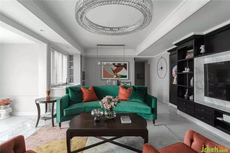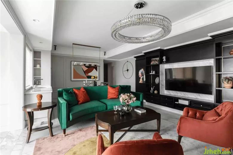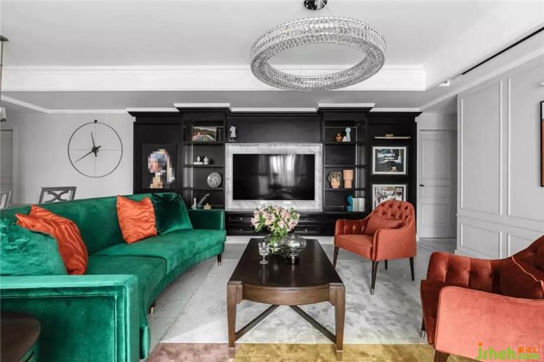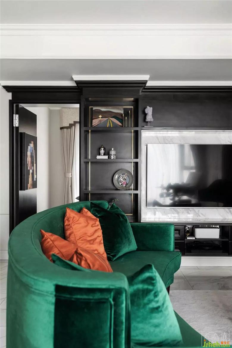 整個(gè)空間的配色都是經(jīng)過了精心的搭配:沙發(fā)、窗簾、抱枕、定制油畫,墨綠色、黑色和橘色貫穿在整個(gè)客廳餐廳區(qū)域。
