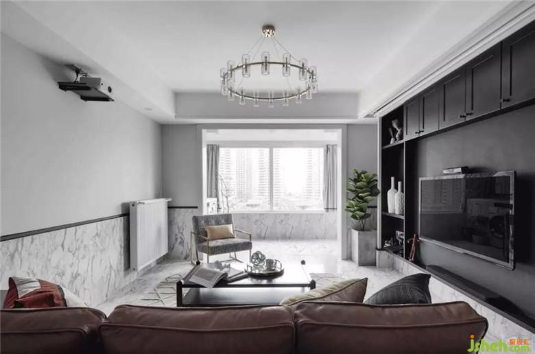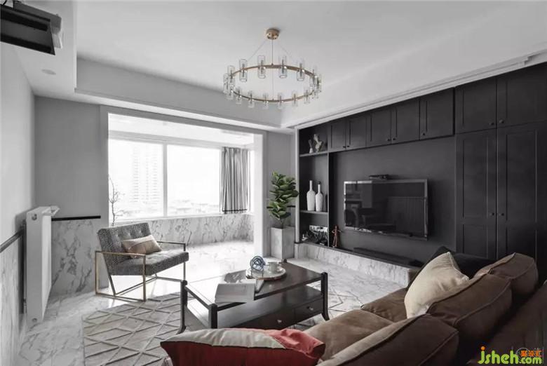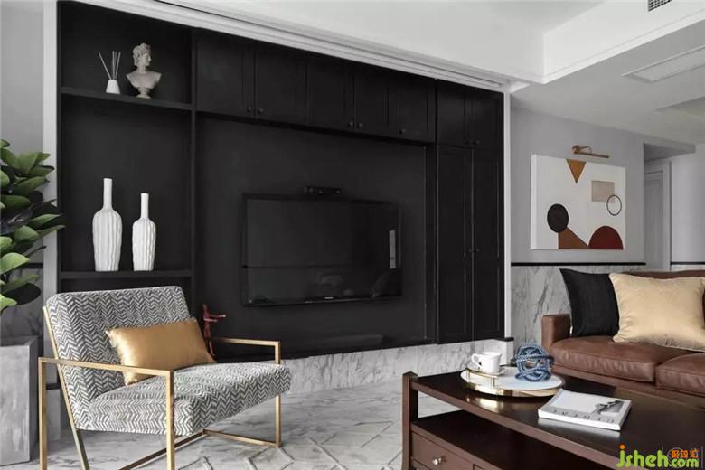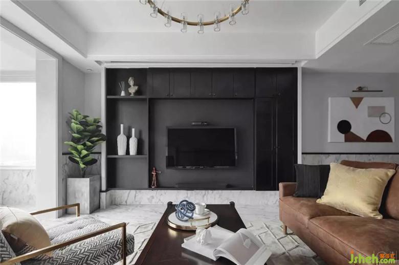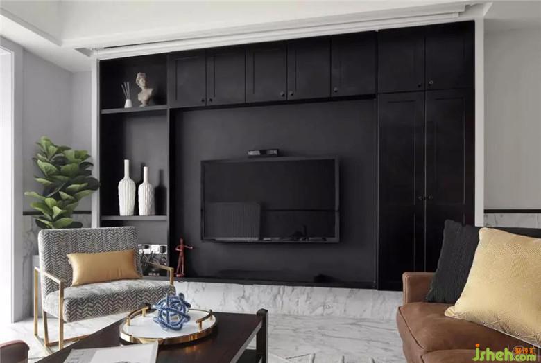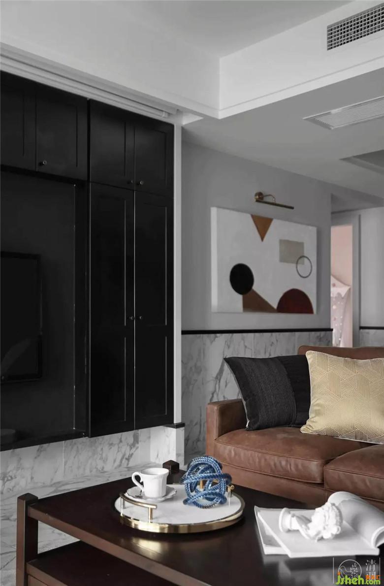 因?yàn)榧依镉袑櫸铮晕覀冊(cè)诳蛷d做了半墻磚的設(shè)計(jì),這樣更利于日常打理;次衛(wèi)蹲便也是為了方便小狗狗使用而設(shè)計(jì)的。電視背景做了整面挑空的黑色收納視聽柜,我們希望從視覺上解決電視凸出的問題,讓視覺效果顯得更加清爽。我們希望使公共空間承載更多的功能,給家人帶來更多的交流而不僅僅是視聽空間。