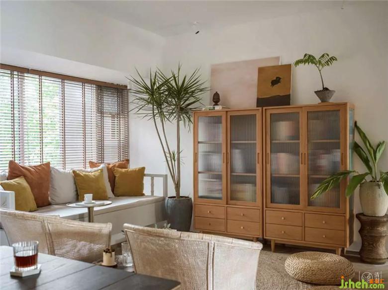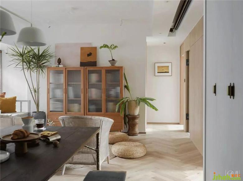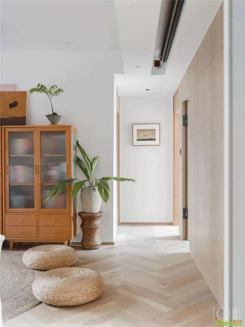 柜體與白色的墻面,頂面延伸出流動的功能動線,換好拖鞋的業(yè)主抬頭,入目便是有著斑駁光影的原木色柜子與綠植,恍然走入陽光明媚,葉影婆娑的清邁小巷,轉(zhuǎn)角既是一片廓落庭院。