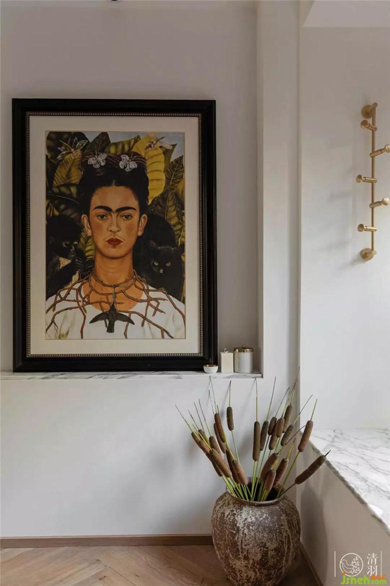 臥室的窗邊還“隱藏”了一幅弗里達(dá)的肖像畫,這是他們從荷蘭萬里迢迢背回來的,我們根據(jù)整體氛圍做了裝裱,并為它定制了一個(gè)淺淺的壁龕,做了一個(gè)迷你的美術(shù)館陳列效果。