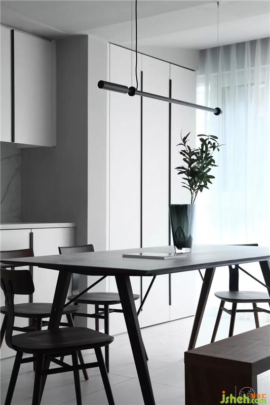 開放式的空間布局,使客廳和餐廳兩個空間之間相互貫通、相互融合。餐廳里我們用白色櫥柜將空間進(jìn)行延伸,用木質(zhì)的餐桌座椅以及家具拉手的黑色線條去緩解了空間里大面積白色帶來的清冷感,也將客廳與餐廳有效的進(jìn)行了融合。