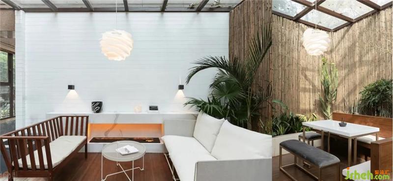 整個(gè)花園設(shè)置了兩個(gè)部分的休息區(qū),靠樓體的墻面用了大面積的深度碳化木刷成簡(jiǎn)單干凈的白色,搭配恣意生長的觀葉綠植、線條簡(jiǎn)潔的木質(zhì)長椅、白灰色的棉麻布藝沙發(fā)和Umage Vita Copenhagen Carmina海浪燈……不知道有沒有能給你海風(fēng)拂面的感覺呢?