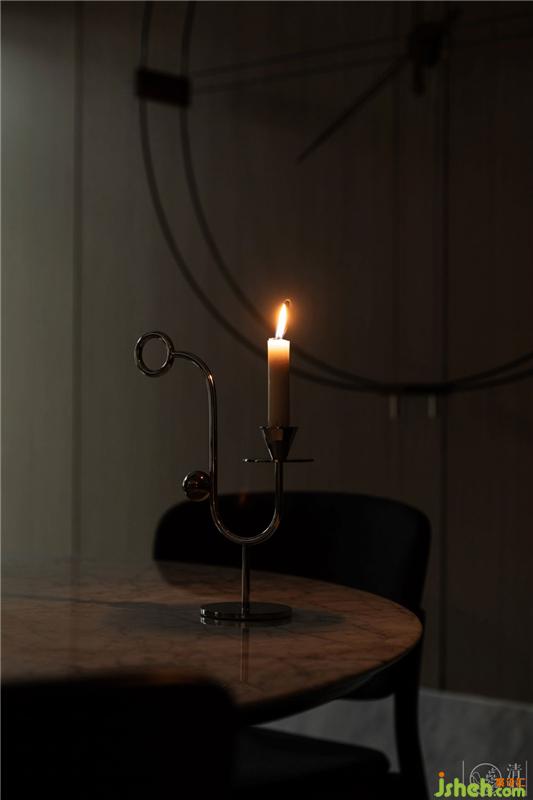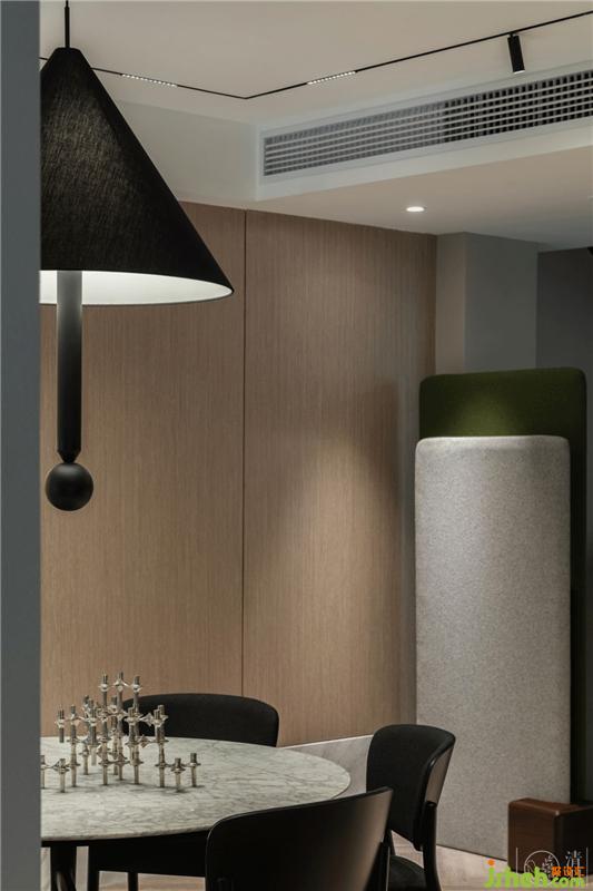 它的中心是餐桌,以及吊燈,我們希望在不打破空間色調(diào)平衡的前提下,讓餐廳顯得活潑一點。于是只能從家具燈飾上下手了。造型略顯俏皮的原版Maison Dada吊燈,CAMERICH銳馳的圓形餐桌,恰好能夠柔和主題空間里那些筆直線條帶來的距離感。