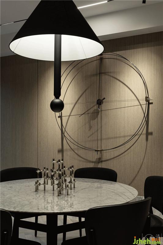 在餐廳上方裝置了一圈磁吸燈,安裝的射燈也可以隨意調(diào)節(jié)位置和角度。黑色的燈軌與Nomon掛鐘搭配起來也極其協(xié)調(diào)。