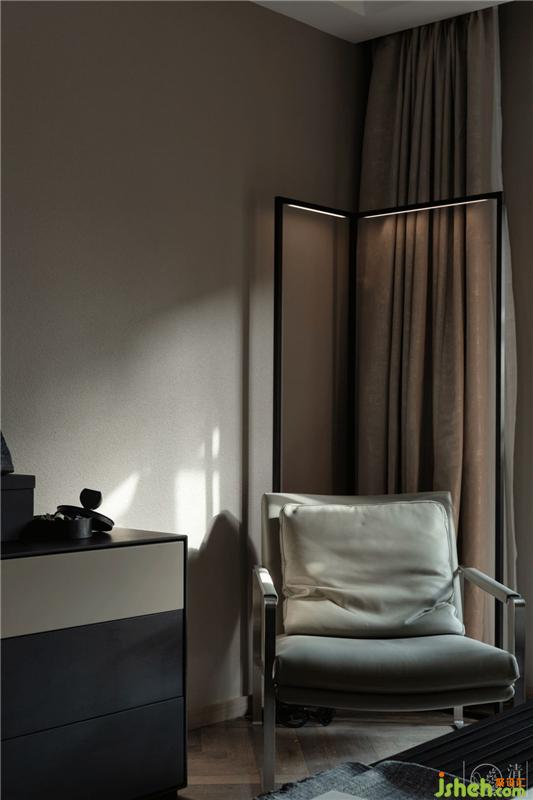 休閑區(qū)借Nemo Spigolo的直角線條落地?zé)簟肮串嫛绷艘粋€(gè)理性的閱讀角落。室內(nèi)設(shè)計(jì)師