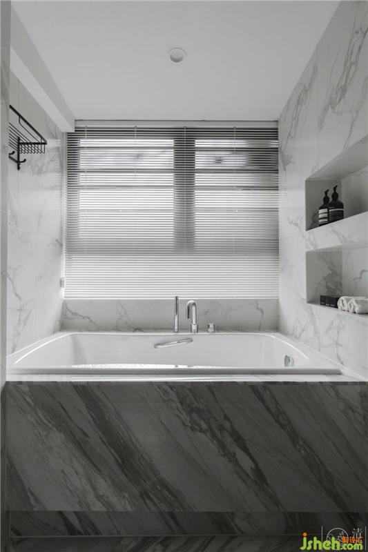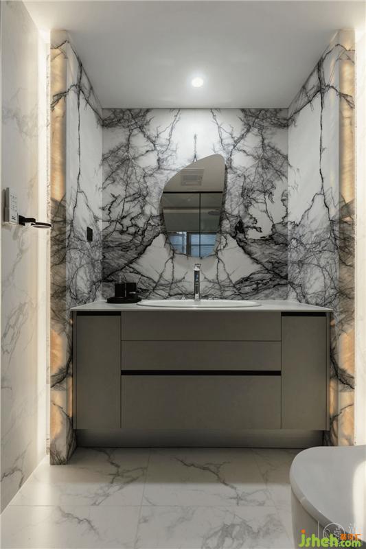 天然大理石背景墻、異形切割的鏡子,顏色清爽的百葉窗,搭配切割整齊的壁龕小空間也可以做出精致大氣的視覺(jué)感受??v向的嵌入式燈帶在夜晚還能給衛(wèi)生間平添一份夢(mèng)幻美感。