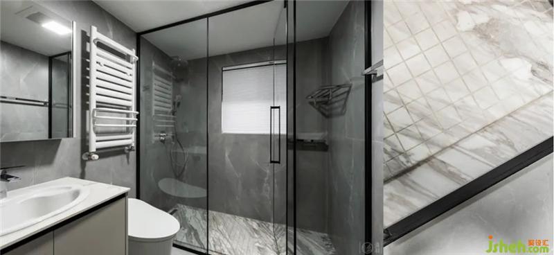 二樓的次衛(wèi)開(kāi)間稍寬闊一點(diǎn),我們?cè)O(shè)計(jì)了到頂?shù)牧茉「魯?,讓空間分割更加完整,地面同樣做了無(wú)高差處理以降低進(jìn)出淋浴間的安全風(fēng)險(xiǎn)。