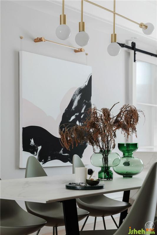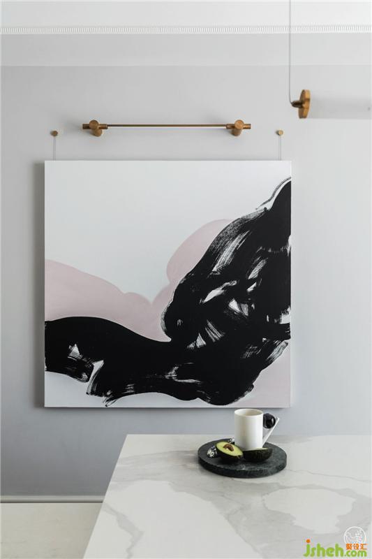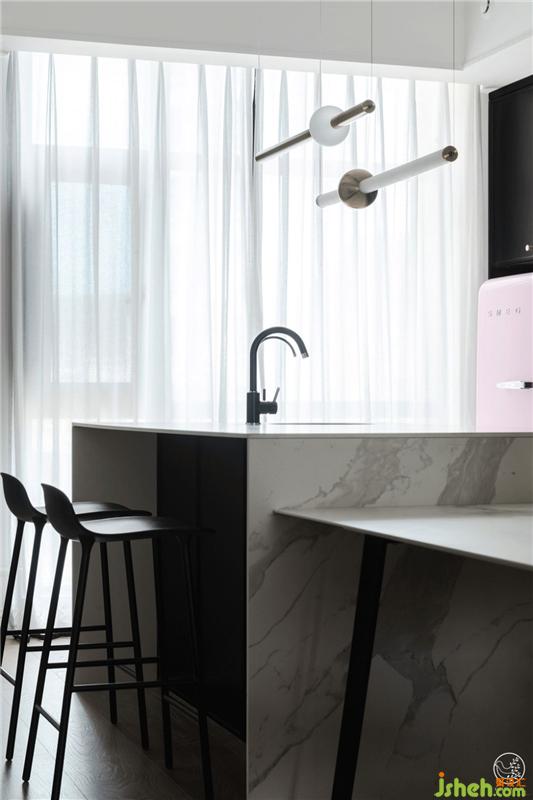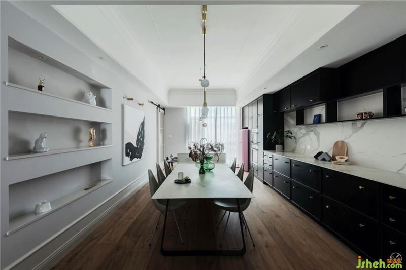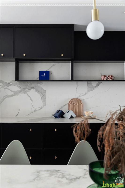 一面是利用原有結(jié)構(gòu)做的內(nèi)凹式造型,展示各種杯具;一面是定制的開放式櫥柜,魚肚白巖板搭配黑色柜門,雅致不俗,充沛的收納空間才會(huì)讓家井井有條,呈現(xiàn)出慵懶隨意的灑脫狀態(tài)。室內(nèi)設(shè)計(jì)師
