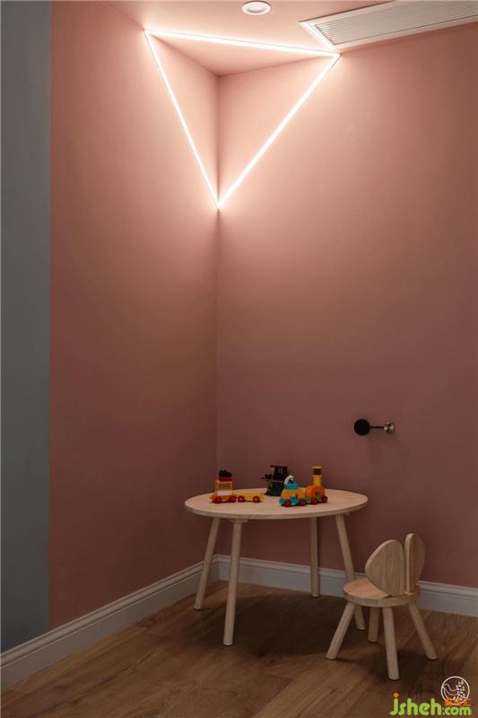 同樣呼應男孩房間,門后做了頂面墻面全粉色的設計,墻角的三角形線條光帶就像愛麗絲的兔子洞,望進去就是一個甜美的異想世界。室內(nèi)設計師