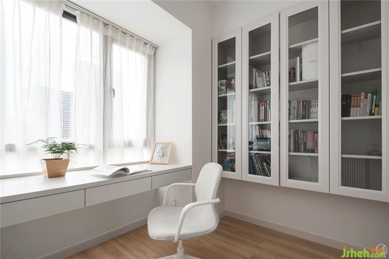 書房中,我們?yōu)閷殞毩粝铝艘恍┤の锻婢摺氖占{空間。此外考慮到家里會(huì)有朋友、客人的留宿,于是設(shè)計(jì)了一個(gè)懸空的書柜,在書柜距離地面處剛好可以增加一個(gè)兩用的沙發(fā)床。