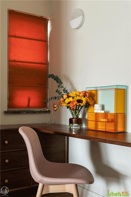 夫妻倆的臥室用了經(jīng)典的藍橙配色,偏深偏冷的藍平和了跳脫扎眼的橙,一半是海水,一半是火焰。
