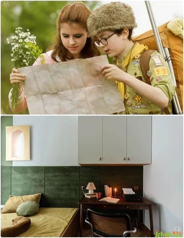 我們以復古綠乳膠漆搭配同色復古綠絲絨硬包,搭配茶褐色,視覺上劃分出休息與書寫區(qū),有意打造出速寫手稿般的歐洲中世紀書房既視感,收了一把Thonet中古懸臂椅是全屋最貴的家具,青春就是這樣任性。
