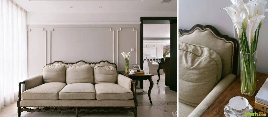 夫妻倆的臥室用了經(jīng)典的卡其色系色搭配深色的木質(zhì)美式床,顏色很好地相互襯托。