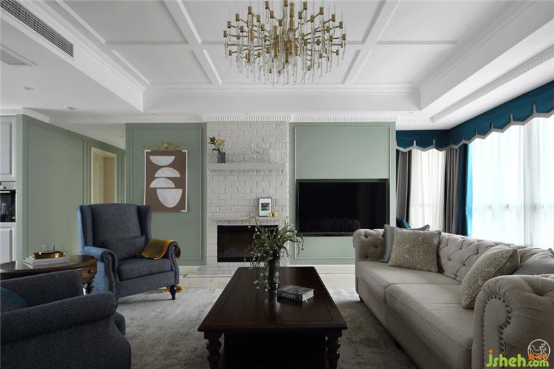 因為Joan不期望將電視掛在壁爐之上,于是我們打破常規(guī),以綠豆灰與白色從視覺及功能上分隔開了電視墻與壁爐。而銀灰色的窗簾,則在壁爐映出溫暖火光時,將原本清新、輕盈的氛圍承托出溫暖的歸宿感。
