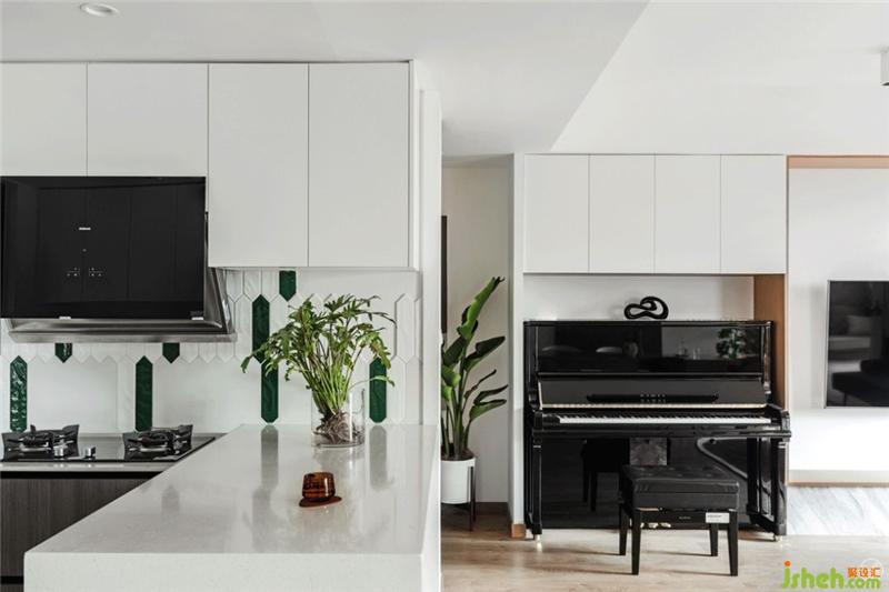 延續(xù)鋼琴的黑白色調(diào),廚房在灶具煙機(jī)和櫥柜臺(tái)面的選擇上,都刻意去貼合這樣的黑白韻律,只在墻面上花了點(diǎn)小心機(jī),墨綠和茶白的瓷磚幾何異形拼接,多了一絲靈動(dòng)和巧思,也呼應(yīng)了客廳的沙發(fā)。