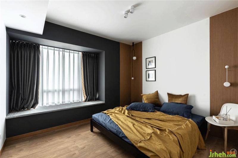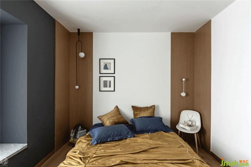 炭灰色、茶白色的漆,碰撞極具質(zhì)感的木質(zhì)轉(zhuǎn)角墻面,兩幅小小的抽象畫(huà),兩盞另類別致的床頭燈,一上一下,一黑一白,這種有所保留與克制的美感,卻充滿了坦蕩的意味,如同最好的親密關(guān)系,無(wú)需過(guò)多贅述就能真情流露。