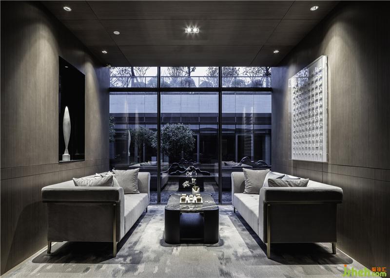 進入地下一層會所大廳,東西兩側(cè)的庭院與中心的隔斷及樓梯內(nèi)外呼應(yīng),展示出自然與空間的互動,配合到頂?shù)难b飾置物架隔斷,整個接待空間顯得沉靜而脫俗,低調(diào)而精致。會所設(shè)計