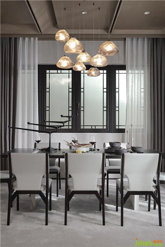 室內(nèi)公區(qū)天花提煉中式梁架結(jié)構(gòu)和坡屋結(jié)構(gòu),將其簡化為經(jīng)典九宮格木構(gòu)造型,用現(xiàn)代手法演繹中式韻味,天花與墻面在色調(diào)上的呼應(yīng)統(tǒng)一,強(qiáng)化了空間在視覺上的延伸感。一層作為生活起居空間,樣板房設(shè)計(jì)將客餐廳與室外完全打開,將更多的自然景觀引入室內(nèi),模糊室內(nèi)與室外、建筑與自然、人與自然的邊界,交互形成,渾然共生。