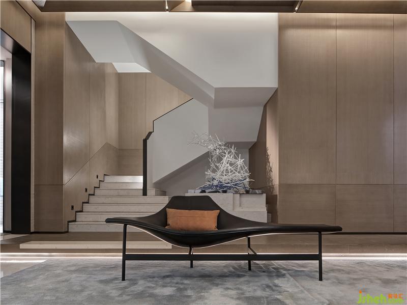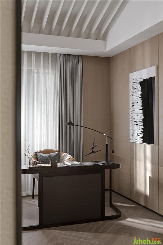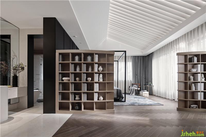 二層作為休憩空間,樣板房設計融合書房、衣帽間及浴室作為整體配套設施,以“梭”為形式設計的柜體天花,喚起童年時代的記憶,天花模擬自然天光,去除裝飾光源,營造自然舒適的睡眠環(huán)境,休息區(qū)面朝戶外景觀,將自然攬入懷中。一把舒適的皮質單椅,一盞意式極簡臺燈,周末午后,拉開窗可見窗外怡人的雅典園林景色;或是疲憊一天后,關上窗簾,開一盞燈,翻閱幾頁林語堂先生的《生活的藝術》,陶情遣興。