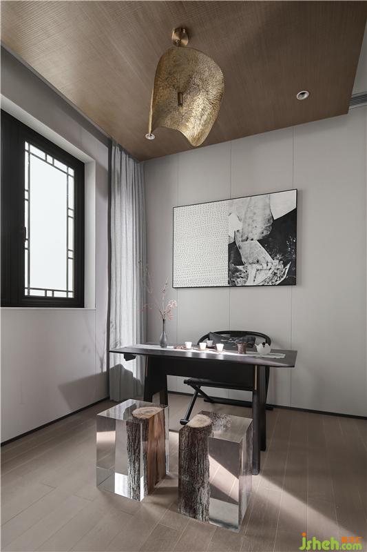 飲茶在嶺南文化中占有重要的一席之地,茶室意境與書房不同,更具傳統(tǒng)意韻。樣板房設計黃銅鑄造的吊燈如荷葉自然寫意,主人椅點亮主旨,客凳則由鉑晶樹脂與原木融合,東西交融意味十足。