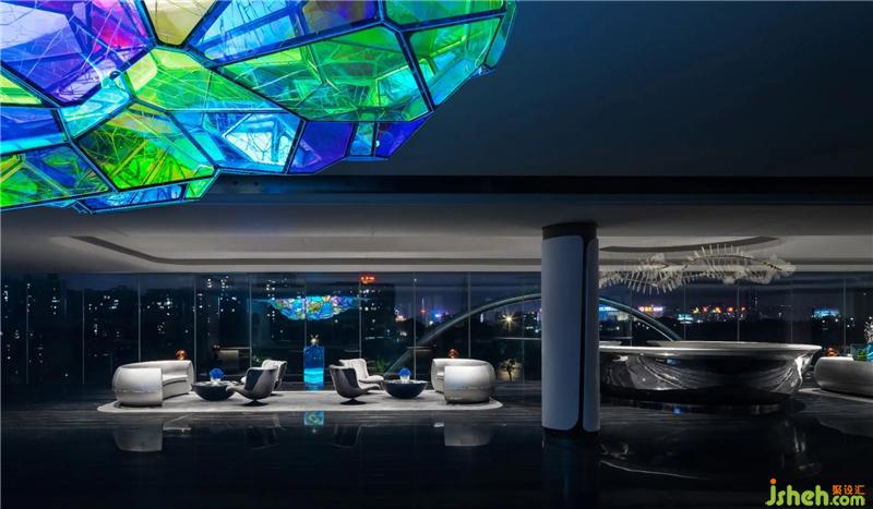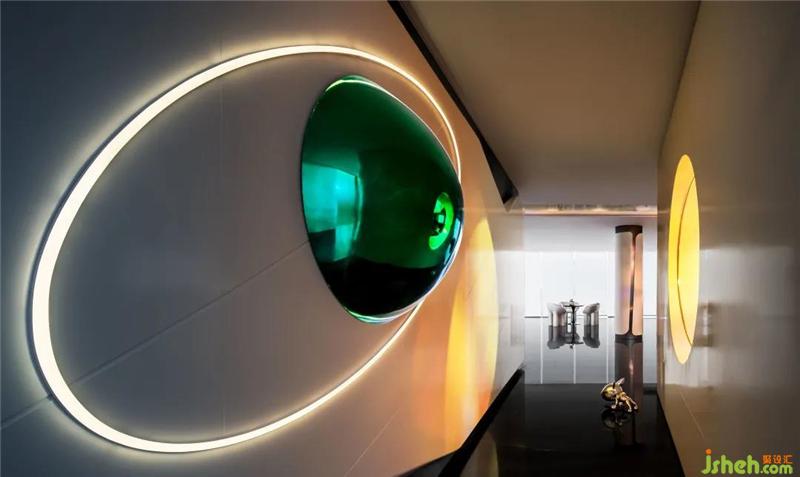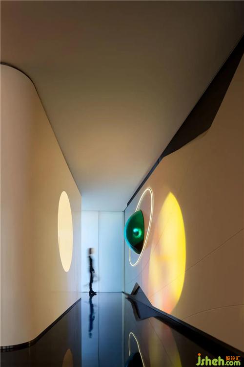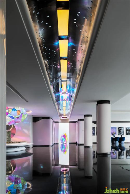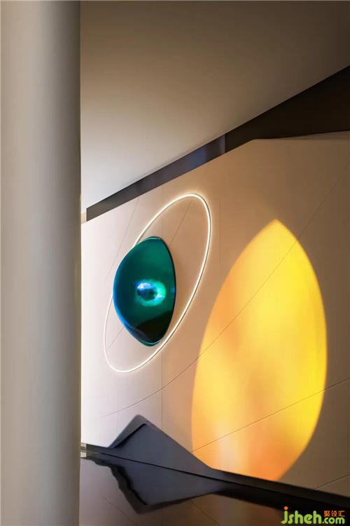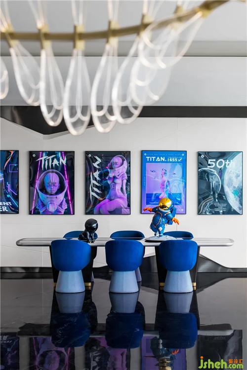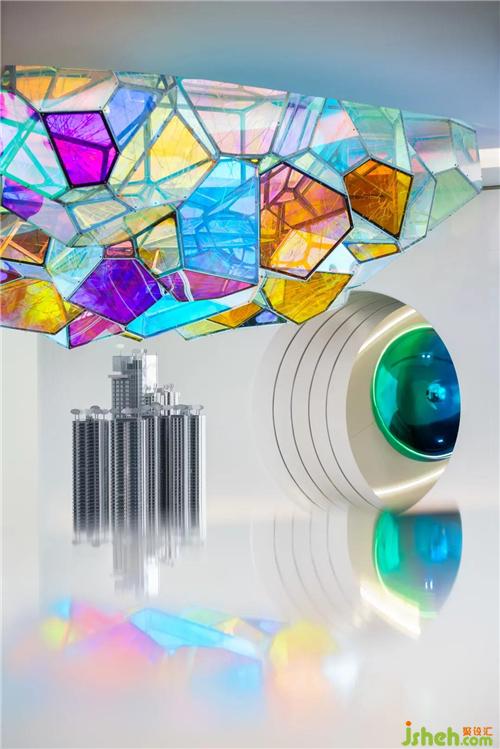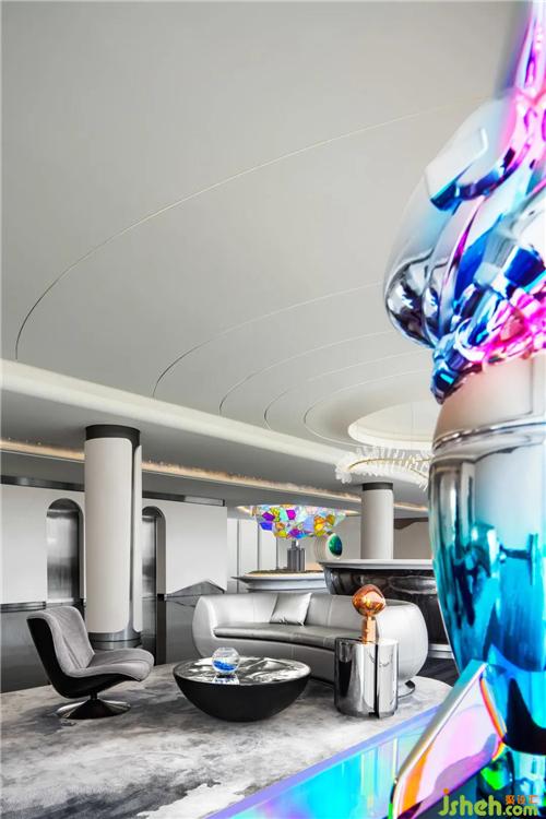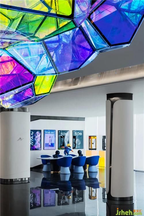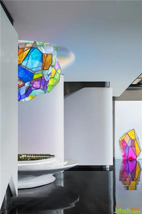 超過(guò)半數(shù)的藝術(shù)擺件并未采用「ALTTA來(lái)自星球」產(chǎn)品的常規(guī)尺寸,而是依照空間尺度而專(zhuān)門(mén)定制,每個(gè)IP人物都朝著訪(fǎng)客所在的方向,期待某刻靈魂覺(jué)醒,細(xì)細(xì)講述天際見(jiàn)聞??臻g以白色為主色調(diào)——它具有最廣的光譜范圍,東莞售樓處設(shè)計(jì)也是宇航服的常用色。像是陷入冰河時(shí)代,萬(wàn)物驟然凝固,液體依托墻面或柱身在,于將靜未靜之隙,留下曾經(jīng)奔涌的實(shí)證。在此之上,宇宙的蔚藍(lán)無(wú)盡、隕石的炫彩斑斕便有了依托,充分彰顯自我的存在。沙盤(pán)區(qū)以人造石為底、「隕石」(即《奔星》)為頂。作品《奔星》緣起于藝術(shù)家華成2020特定時(shí)代背景下的悲觀沉思「是否地球已然不適合生活?」,在此命題下,衍生出對(duì)浩瀚星宇的向往、對(duì)親密關(guān)系的渴求及對(duì)未來(lái)生命的探討,又以奇幻的、絢爛的、神秘的視覺(jué)表達(dá),為空間注入充滿(mǎn)希望的、天馬行空的想象。《奔星》并非靜止不動(dòng),而是以光線(xiàn)的明滅起伏,與人的呼吸共頻,它借助技術(shù),成為某種獨(dú)特的「生命體」。